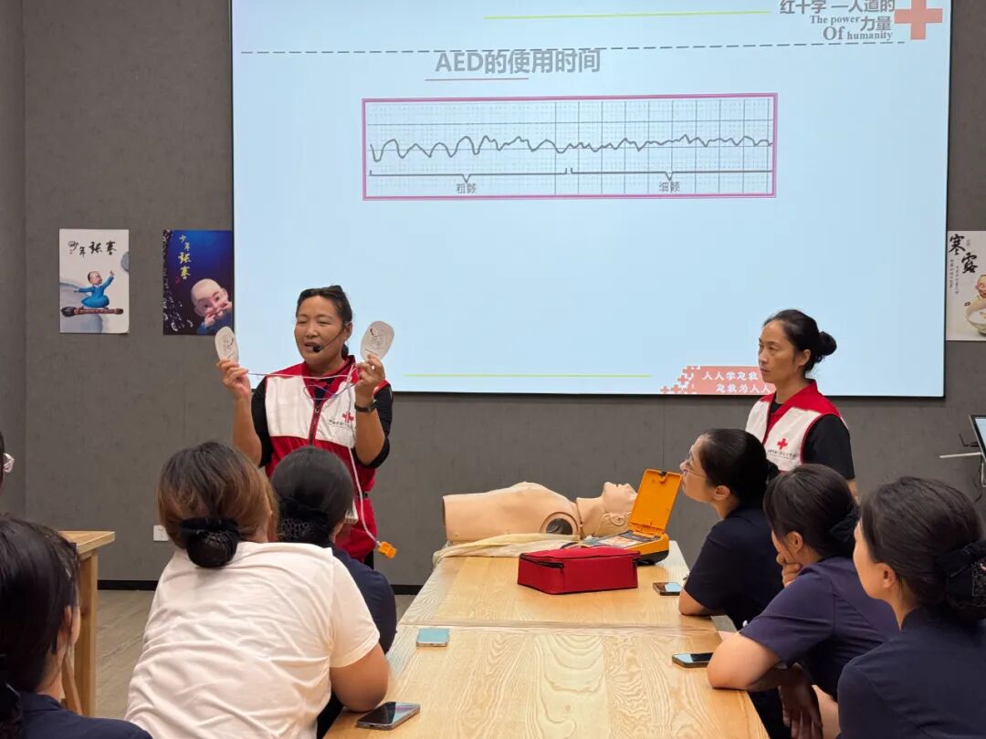 区红十字会应急救护培训师重点围绕心肺复苏、创伤包扎、AED使用等实用急救技能展开教学。培训现场特别模拟了游客突发心脏骤停、儿童气道异物梗阻等旅游场所常见意外场景,参训人员认真听讲、积极互动,在专业指导下反复练习急救手法,快速提升了应对突发事件的处置能力,通过理论考核与实操演练,全员取得初级救护员证。