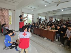 9月23日,泗阳县红十字会组织应急救护师资走进里仁中学开展“乡村护蕾”应急救护专项培训活动。 活动现场,应急救护师资向参训的师生宣传红十字运动的起源、红十字会业务等知识